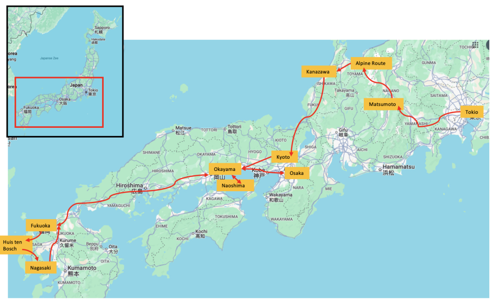 De reis start in Tokio. Aanbevolen terugvlucht is vanaf Osaka (Kansai Airport).